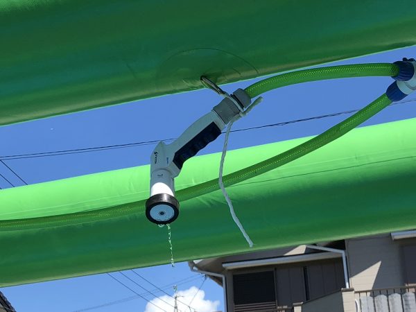 エアーを入れて膨らませた後は、ホースを通して簡易的なシャワールームが完成します。