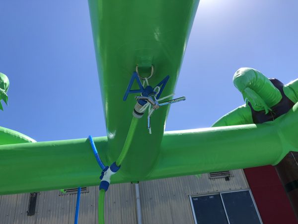 ③全て広げきったら、ハンドブロワーを遊具につなげていきます。電源は1口必要です。
