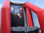 エアートランポリンと柱につないだゴムの力を使って上空まで身体をジャンプさせます。ハーネスを身体に装着してジャンプします。ジャンプする力が足りない場合、運営スタッフがサポートを行います。