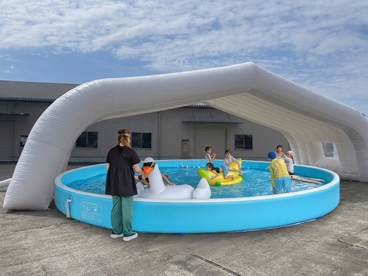 テントの下にプールを設置することで、夏の屋外でも安全に水遊びイベントを開催できます。