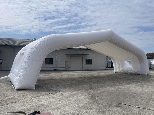 従来のテントとは異なり、複雑な組み立て作業が不要であり、送風機を使って空気を入れるだけで約15分程度でテントが立ち上がります。