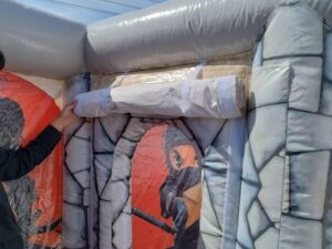 ④遊具本体に2か所あるチャックを閉め、送風機のスイッチをONにします。