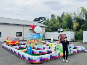 ③全て広げきったら、送風機を遊具につなげていきます。電源は2口必要です。