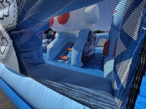 ③全て広げきったら、送風機を遊具につなげていきます。電源は1口必要です。