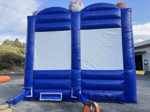 ③全て広げきったら、送風機を遊具につなげていきます。電源は1口必要です。