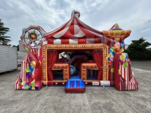 カーニバルキッズコンボは、遊園地をモチーフにした華やかでカラフルなエアー遊具です。