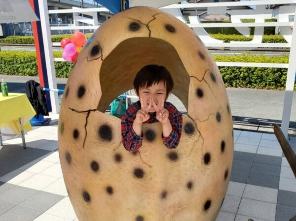 最後は恐竜ヘッドチェアに座って記念撮影です。 いい笑顔。