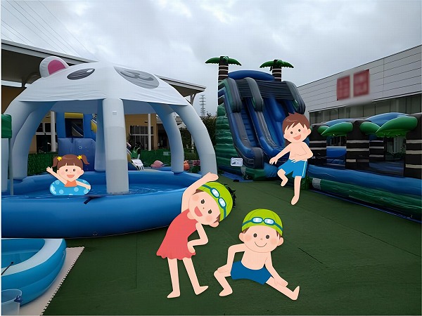 床噴水の周辺スペースをさらに楽しく拡張するなら、ミストを浴びながら楽しめるエアー式迷路を併設してみてはいかがでしょうか。