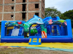 大きなサメやタコのほかに、海の生き物たちのオブジェがいっぱいの超巨大なエア遊具です。